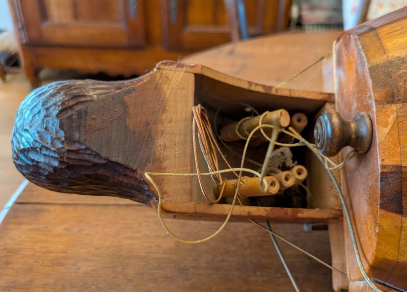 repose-corde pour la 1ère chanterelle qui en était dépourvue ![]() Ensuite j'ai accordé les sautereaux corde par corde avec un accordeur électronique puis ajusté les deux cordes à l'oreille. Cordes sympathiques : J'installe ensuite les 4 cordes sympathiques (0.30) accordées au sol des chanterelles. On obtient effectivement un effet de réverbération ! ![]() ![]() Bourdons : Pour l'installation des bourdons, je découvre un problème inattendu ! Le remplacement des grosses et grandes chevilles d'origine par des chevilles mécaniques fait que les trous de passage des bourdons dans le chevillier ne sont pas du tout en face des petits cylindres de ce type de cheville mécanique. Le premier essai avec le gros bourdon montre que l'angle que fait cette corde dans le chevillier empêche l'enroulement et l'accroche nécessaire ! La seule solution à ce problème est de repercer des trous de passage des cordes plus haut dans le chevillier ! ![]() La disposition dans le chevillier s'est ainsi améliorée : ![]() ![]() avant après Après ces quatre perçages (diamètre 4.5 mm) l'installation des nouvelles cordes peut commencer. Gros bourdon : Sol – G2 (Savarez KFA 854) o Il n'appuie pas sur la roue ! La corde n'est pas parallèle ni au clavier, ni à la roue. L'encoche dans l'oreille est trop basse de 5 mm. o Je refais une encoche 5 mm plus haut dans l'oreille à la lime, mais cela ne suffit pas pour rapprocher la corde de la roue. J'ajoute aussi une encoche sur le chevalet des bourdons. ![]() Petit bourdon : Do – C3 (Savarez KFA 484) o Essai d'accord avec coton, ce n'est pas Ok. Le bourdon se met à faire Wouah-wouah deux fois par tour de manivelle. Manifestement la roue est encore trop ovalisée ! o C'est ici que je dois reprendre le tournage de la roue ! (voir ci-dessus) ... et j'obtiens enfin un bourdon stable! Mouche : Sol – G3 (Savarez KF91) o Elle n'appuie pas du tout sur la roue (écart de 2 ou 3 mm) ! J'approfondis à la lime l'encoche dans l'oreille (gros écart) et j'ajoute une encoche plus serrée dans le chevalet. Je ne comprend pas un tel écart alors que les oreilles et le chevalet n'ont pas été modifié ! J'en conclu que le précédent propriétaire n'utilisait pas la mouche. Trompette : Do – C4 (Savarez KF 77) o mise en place d'un chien en érable (fabriqué par un luthier) et ajustement dans la fente du chevalet o montage de la corde, coton o marquage au crayon du passage de la corde sur le chien et réalisation d'une encoche. o installation d'une nouvelle cheville en ébène pour le tirant (extrémité de la cheville percée à 2 mm) et fixation du lien du tirant o essai du chien et ajustement ![]() Et toutes les cordes sont installées et fonctionnelles !!!