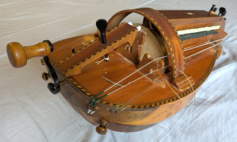 Cette vielle à roue est à l’origine un semi-kit Camac acheté à Paris (Rue de Rennes) début 1979 pour la modique somme de 1.595 Francs (ce qui, selon l’INSEE, ferait environ 780 € en 2020). Semi-kit signifie que la caisse est déjà montée (fond, table, éclisses sur structure interne). Cette vielle a été montée en région parisienne chez mes parents, dans ma chambre, avec le peu d’outils dont je disposais à l’époque. Peu de temps après, j’ai « amélioré » son esthétique en faisant des essais de marqueterie. Ce type de