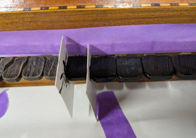 en tournant la roue (une fois n'est pas coutume !). Aspect extérieur : J'ai ensuite passé sur toutes les parties vernies de la "popote à verni". Cela a bien nettoyé les surfaces qui sont maintenant plus présentables (mais cela n'a pas restauré les manques de vernis !). Les touches noires du clavier ne sont plus très lisses et la peinture noire est altérée voir manquante. Je commence par polir ces touches sur le dessus et surtout sur la tranche ! Ensuite je passe une couche de peinture "noir profond, mat velouté". Après séchage on dirait presque de l'ébène ! ![]() Réglage du clavier : J'ai d'abord calculé le diapason d'origine. En mesurant les espacements entre les tangentes et en utilisant un tableau Excel pour calcul d'un clavier en tempérament égal, le diapason correspondant à cette disposition des tangentes est de 350 mm. Mais en mesurant entre sillet et chevalet