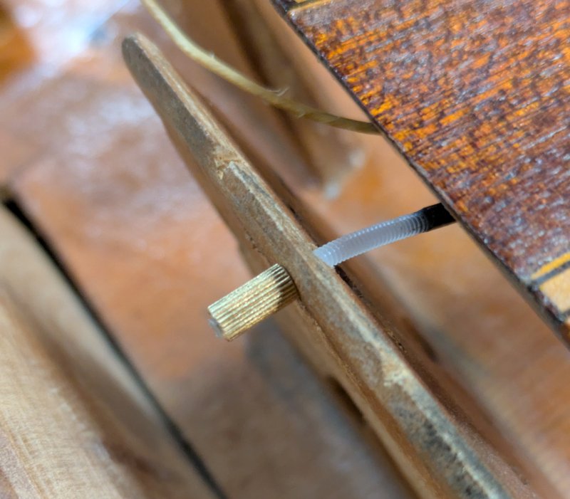J'installe ensuite les 4 cordes sympathiques (0.30) accordées au sol des chanterelles. On obtient effectivement un effet de réverbération, surtout avec les chanterelles à vide. ![]() ![]() Il reste à installer les 4 bourdons et ajuster et mettre en place un chien sur la trompette.. A